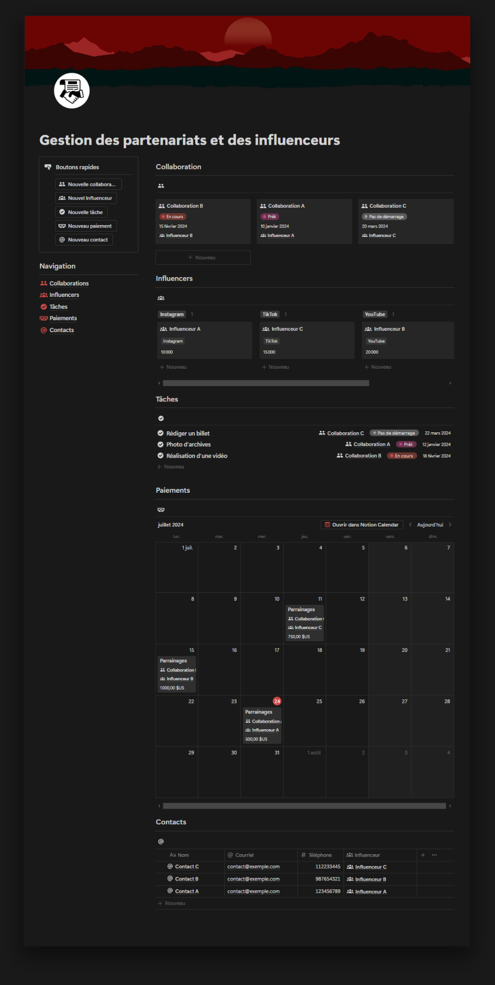 - Contacts : Centralisez toutes les informations de contact pertinentes en un seul endroit. Accédez rapidement aux coordonnées de vos collaborateurs et influenceurs, ce qui facilite la communication et la coordination.